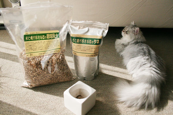 パールにおやつをあげた後、猫草の種まきをしました