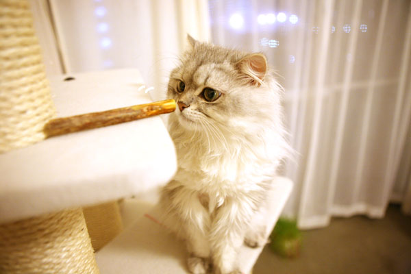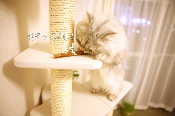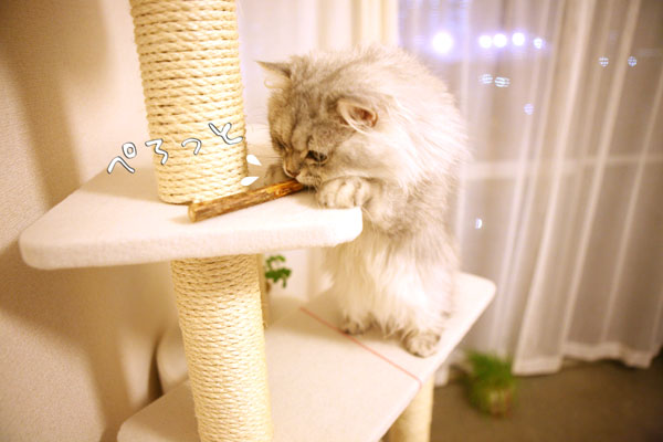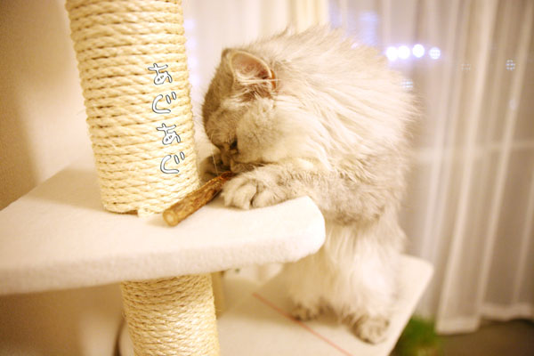 またたびの木をタワーにのせ、パールをタワーにセッティング!